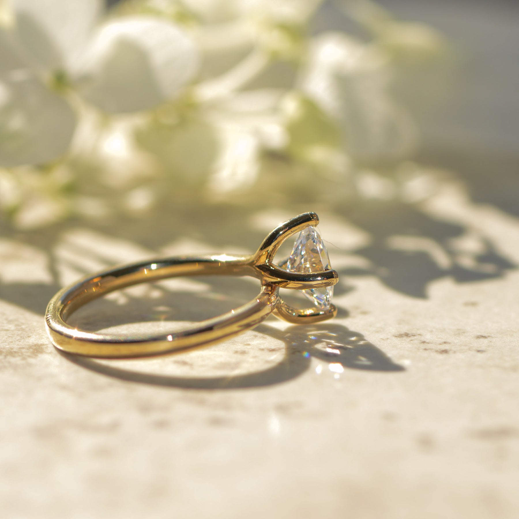 Gold engagement ring with an oval cut diamond on a light surface with blurred flowers in the background