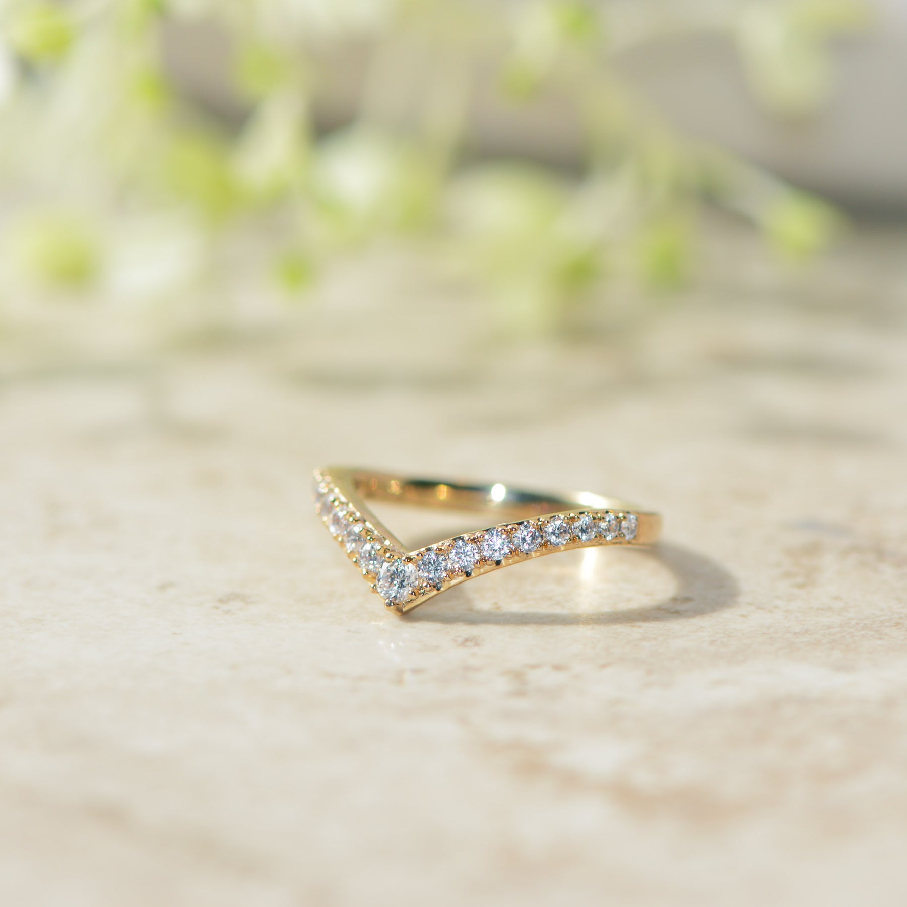 Gold chevron wedding band with pavé set diamonds on a marble surface