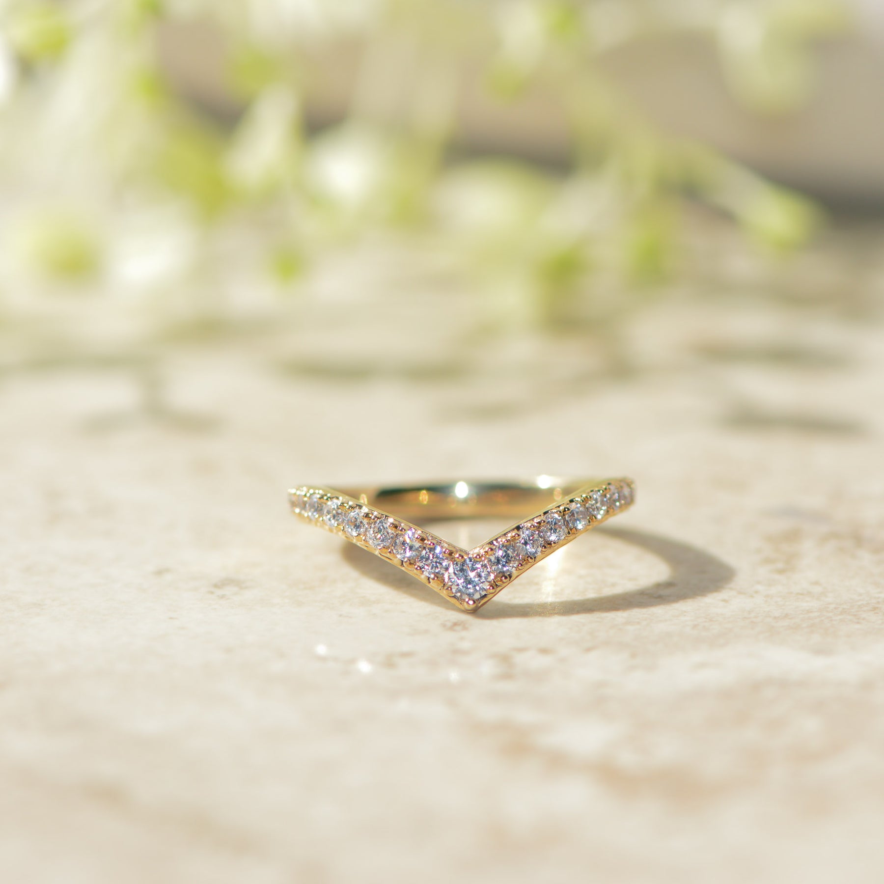 This exquisite chevron wedding band, named Wenna after the Cornish word for 'fair one.', is a gentle homage to inherent charm. Thoughtfully designed to harmonise with your engagement ring, it adds a brilliant sparkle to your bridal stack.