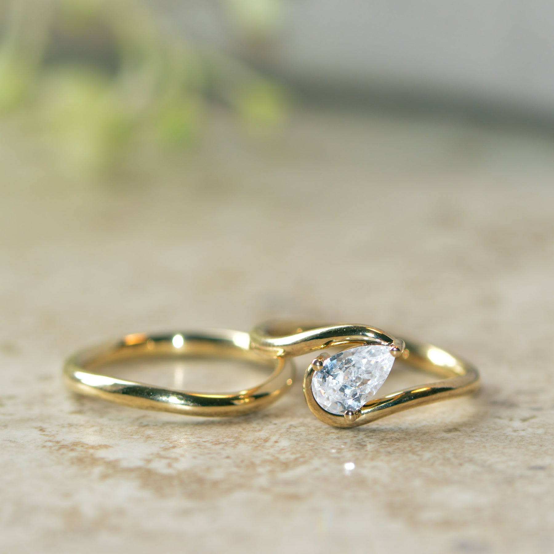 This unique silhouette, with its gentle curve, allows the rings to sit together beautifully, even with lower-set engagement rings, forming a perfectly curated bridal stack that feels entirely yours.